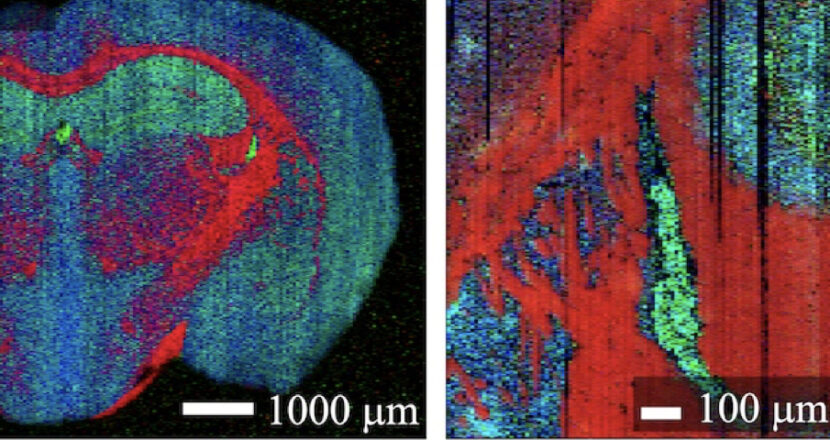 私たちは,試料の凹凸形状をナノスケールで計測することが可能な原子間力顕微鏡の要素技術をt-SPESIに融合し,試料の形状情報をリアルタイムに計測しながら抽出とイオン化を行う技術を実現しました.本技術を用いて,マウス脳組織切片の複数の脂質を空間分解能6.5マイクロメートルでイメージングでき,複数の脂質のマススペクトルパターンの違いに基づく脳内構造の分類が可能であることを示した.さらに,t-SPESIの医用応用として,ヒト疾患組織の共同研究も実施しています.大阪大学医工理連携共同研究を通じて,ヒト心臓疾患組織中の脂質成分群の多様な分布形態の可視化にも成功しました.今後は、ピコ液体の抽出イオン化過程の物理的理解と制御法の研究を進め、更なる高空間分解能イメージングを目指します。