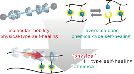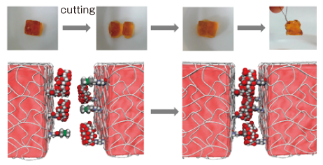 Cyclodextrin is a cyclic molecule that can subsume various hydrophobic molecules in its interior, in what is known as host–guest interactions. We have already obtained a sharp increase in toughness by incorporating cyclodextrin and a hydrophobic group into the polymer side chain and by using the host–guest interaction as a crosslinking point to produce a gel. This material also exhibits a strong self-repair capability.
