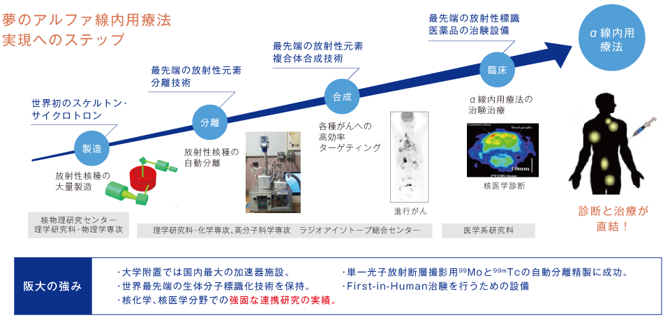 本拠点は、放射線科学基盤機構、核物理研究センター、医学系研究科、そしてRIセンターの協力のもとに、難治がん治療のための新規アルファ線核医学治療法の開発に取り組んでいます。そのために、高ビーム強度、省電力のスケルトン・サイクロトロンの開発や、アルファ線放射性核種の多量製造法と生成核種の自動分離法の開発を進めています。さらに放射性核種をがん標的剤と結合させて放射線医薬候補を製造し、治療効果と副作用の検証を行い、アルファ線核医学治療法の治験、治療に結びつけることを目指しています。